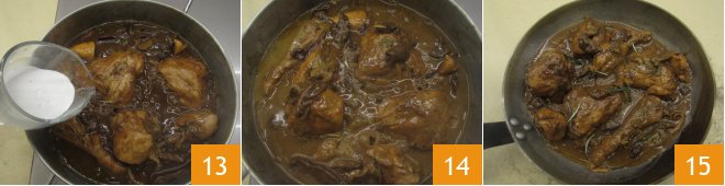 the well-drained mushrooms (do not discard the water, it will be used later) 10, then salt and pepper to taste. Strain and then use 1 1/4 cups of the mushroom soaking water 11. Cover with a lid 12 and let cook for 50 minutes over low heat, occasionally turning the chicken thighs.
