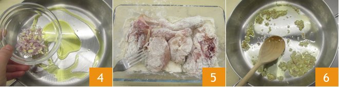 In a saucepan, pour the sauté and a swirl of oil 4, stew for about 7-8 minutes over low heat. Meanwhile, pour the flour into a baking dish and thoroughly coat the chicken pieces 5. When the shallot is stewed 6