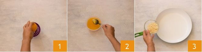 To prepare the chicken with orange and almonds, first, squeeze the oranges 1. Then strain the juice and add 1 tablespoon of honey 2, stirring to dissolve it. Pour the sliced almonds into a pan 3