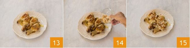 When the drumsticks are ready, transfer them to a plate 13, garnish with the almond slices 14, and serve 15.