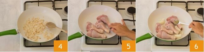 and toast them for a few minutes over medium heat 4. Transfer to a small bowl and set aside. In the same pan, place the chicken drumsticks, the onion cut into wedges, and the rosemary 6.