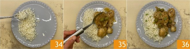 After the cooking time, turn off the heat, cover with the lid, and let it rest for 2 minutes 31 so that it absorbs all the water 32. In the meantime, the chicken's cooking time will also have elapsed; check that it has absorbed almost all the broth 33.