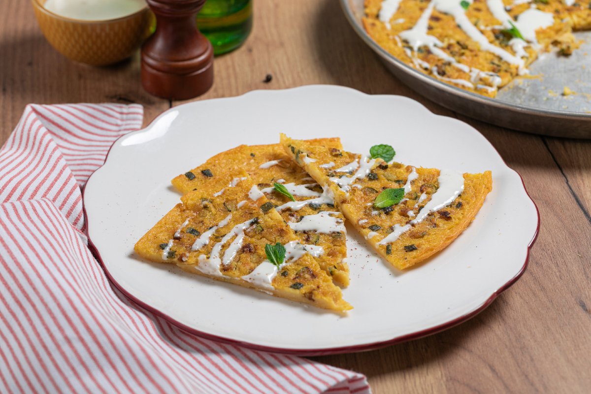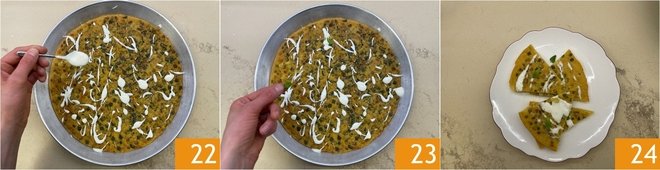 Spread the pecorino fondue over the surface 22 and garnish with a few fresh mint leaves 23. Serve your chickpea farinata with zucchini and pecorino fondue immediately, while hot 24.