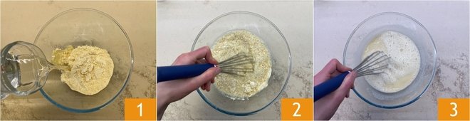 To prepare the farinata with zucchini and pecorino fondue, pour the chickpea flour into a large bowl and add the water little by little 1, whisking constantly to avoid lumps 2, until you obtain a smooth, fluid batter 3.