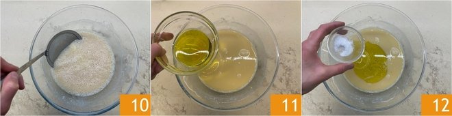 After the resting time, take back the batter and, using a skimmer, remove the foam that has formed on the surface 10. Add the oil 11 and the salt 12.
