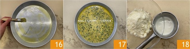 Grease the bottom and sides of a 12.6-inch (32 cm) aluminum pan with about 2 tsp (≈10 g) of oil 16, pour in the batter and spread it evenly 17. Bake in a conventional oven preheated to 428°F. Place the pan initially on the lowest rack, directly under the heating element, and bake for 10 minutes; then continue baking on the middle rack for another 10–15 minutes, until the surface is well browned. When a few minutes remain, prepare the pecorino fondue: warm the cream in a small saucepan without bringing it to a boil, then add the grated pecorino off the heat 18.