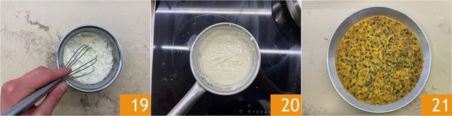 Whisk well to combine 19, then return to the heat and stir until you reach the desired consistency 20. As soon as the fondue is ready, remove the farinata from the oven 21.