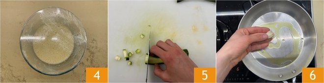 Cover with plastic wrap 4 and let the mixture rest for about 5 hours at room temperature, or in the refrigerator for up to 12 hours. In the meantime, wash the zucchini, trim the ends and cut them into uniform cubes of about 1/4 inch (0.5 cm) 5. Heat a skillet with a drizzle of oil (about 1 tbsp / 15 g) and one clove of garlic 6.