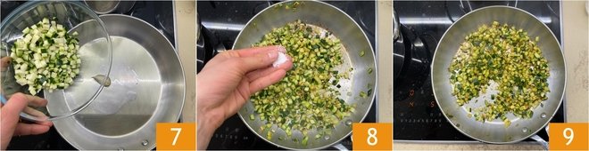 Add the zucchini 7 and sauté over medium heat for about 8 minutes, until tender but still slightly firm. Season with salt 8, remove the garlic and let cool completely 9.