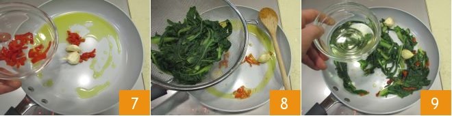Now pour the oil into a pan, add the lightly crushed garlic cloves with part of the chili 7, and let it sauté over medium heat for a few minutes, stirring occasionally. Then add the blanched and drained chicory 8, salt, and mix. Then pour in a little of the reserved chicory cooking water 9.