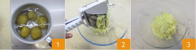 To prepare Chifeletti, take 500 g of potatoes (about 1 lb), scrub the skin well, then wash them. Now place the prepared potatoes without peeling them to boil in plenty of salted water for about 25 minutes 1. To cut cooking time in half, you can cook the potatoes in a pressure cooker. When they are cooked and soft enough to be mashed, peel them while they are still hot and pass them through a sieve or potato ricer, depending on your preference 2. Then let them cool 3. Place the mashed potatoes in a large bowl (or on a work surface if you prefer).