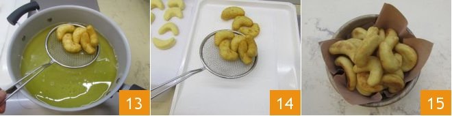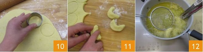 Then, using a pastry cutter or a glass, cut circles with a diameter of about 6.5 cm (approximately 2.5 inches) 10. Fold the circles in half and lightly press them halfway along their length, thus forming the classic crescent shape 11. (Alternatively, you can form a very long stick with the dough about the thickness of a middle finger. Cut the stick into pieces about 4 inches long and bend them to form many "horseshoes." With this method, the final shape will be less plump, but the end result of the Chifeletti will be equally excellent!). At this point, heat extra virgin olive oil in a high-sided pan. Take a kitchen thermometer to check the oil temperature. When the oil temperature reaches 338°F 12,