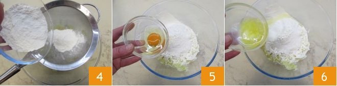 At this point, add the flour 4, the egg 5, melted butter 6, and sugar 7.