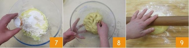 Now adjust with salt and pepper. Mix all the ingredients well, until you obtain a homogeneous and dry mixture (if not, add a bit more flour) 8. Let it rest covered with plastic wrap for 30 minutes. Take the rested dough and roll it out on a work surface with a rolling pin 9.