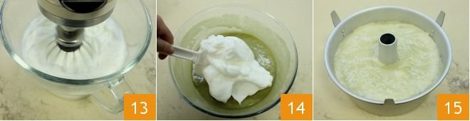 Continue working the egg whites until they are well voluminous and frothy 13, then incorporate them into the yolk and pistachio paste mixture, stirring gently from top to bottom to prevent deflating the egg whites 14. Pour the mixture into the chiffon mold 15 (or into a sponge cake mold with measurements of 8.5 inches diameter at the bottom, 10 inches diameter at the top, and 4 inches in height). Bake the multicolor chiffon cake in a preheated static oven at 320°F for 55 minutes (or in a convection oven at 285°F for about 50 minutes).