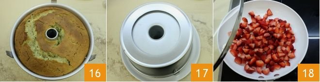 Once cooked, remove it from the oven 16 and invert the mold, resting it on the special feet 17: this way, the cake will cool by incorporating air without deflating. Meanwhile, as the chiffon cools completely, prepare the glaze: in a large pan, cook the chopped strawberries over low heat, covering with a lid 18.