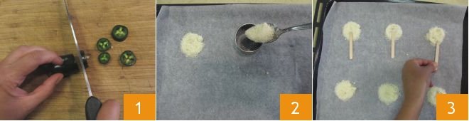 To prepare the chili pepper and Grana Padano lollipops, first cut the chili peppers into slices about 1/8 inch thick 1, then grate the Grana Padano PDO and line a baking sheet with parchment paper. Pour a teaspoon of grated Grana on the tray using a 1.5-inch diameter round cutter to form 6 slightly spaced discs 2, then place a popsicle stick at the base of each disc 3.
