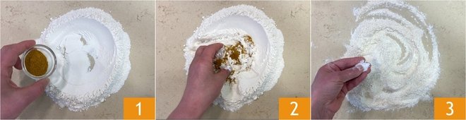 To make the chicken curry dumplings, start with the dough: heap the flour on your work surface, flavor it with the curry 1 and mix it in with chopsticks or your hands 2, then add a pinch of salt 3.