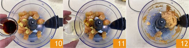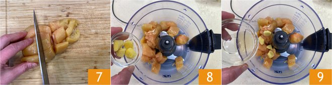 Meanwhile, prepare the filling: cut the chicken breast into cubes 7 and transfer to a food processor. Add the ginger 8 and the rice wine 9.