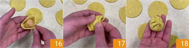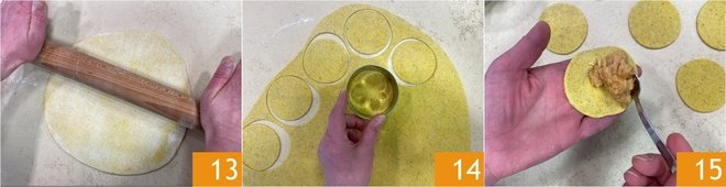 After the dough has rested, roll it out on a lightly floured surface to a thickness of about 2 mm 13. Cut out discs with a round cutter approximately 3¼–3½ in (8–9 cm) in diameter; with these quantities you will get about 20 14. Take one dough disc and place a teaspoon (1 tsp) of filling in the center 15.
