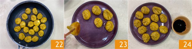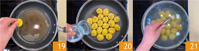 Move on to cooking: heat a drizzle of vegetable oil in a nonstick skillet, then place the dumplings in the pan 19 and brown them over medium heat for 2 minutes. When the bottoms are golden, pour in the water 20 and immediately cover with a lid 21.