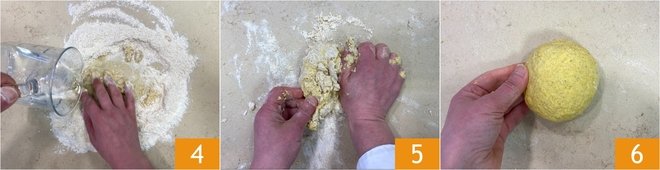 Gradually pour warm water in a slow stream while kneading with your hands 4, then continue working the dough for about ten minutes 5 until you obtain a smooth, elastic, homogeneous ball 6. Wrap it in cling film and let it rest for 30 minutes in a cool, dry place.