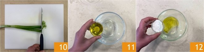 At this point, chop the green part of a scallion 10 and set it aside. Then prepare the emulsion. In a bowl, pour the water, oil 11, and flour 12.