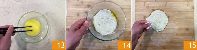 Mix always with chopsticks 13 or with a fork, until you get a homogeneous mixture. Take the rested dough 14 and transfer it onto a lightly floured surface; also flour the surface 15.