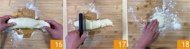 Form a cylinder 16 and divide it into 4 equal parts 17. Take the first portion and flatten it with your hands 18.
