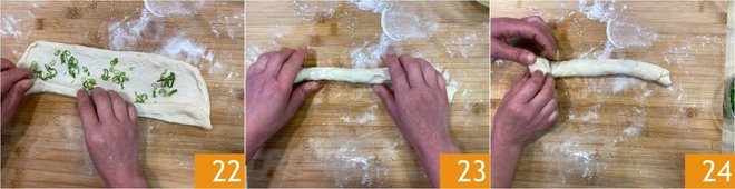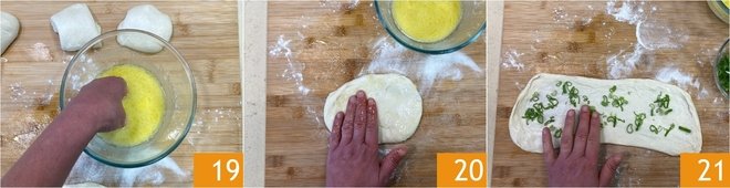 Moisten your hands in the emulsion 19 and flatten the dough again 20 until you get a thin rectangle. Then sprinkle with scallion 21.
