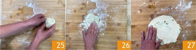 You should form a swirl 25. Gently press it down with your hands 26, adding flour as needed. You should obtain a thin disc 27.