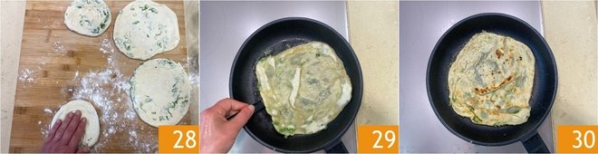Continue this way until you form all 4 of your pancakes 28. Now move on to cooking, heat a slightly larger pan with a little oil. Place the first pancake inside 29, brush it with the emulsion and cook until it is nicely golden. Then turn it over 30.