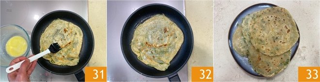 Brush it again with the prepared emulsion 31 and continue cooking 32. Cook the others as well and serve your Chinese pancakes 33.