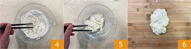 Mix with chopsticks 4, or alternatively with a fork, and continue pouring the water slowly. You should obtain a dough that is not too smooth, ensuring the water is well absorbed 5. Then transfer the dough onto a work surface 6.