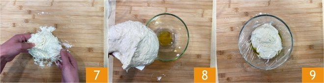 Don't worry if it seems very sticky, it's normal. Work it with your hands for 10-15 minutes 7; if it becomes difficult, use a dough scraper. Transfer the dough into a greased bowl 8. Cover with plastic wrap 9 and let it rest for 30 minutes.