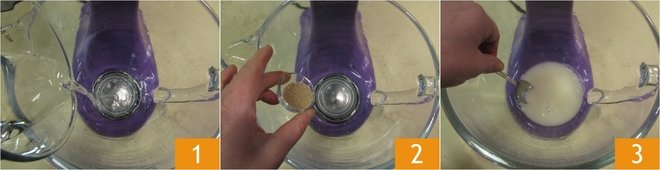 To prepare the mantou, pour the water into the bowl of a stand mixer equipped with a hook 1, add the dry yeast 2, and briefly stir with a spoon to dissolve it 3.