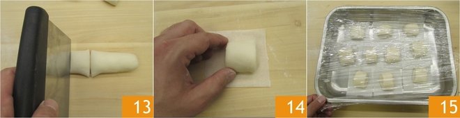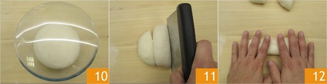 After the rising time 9, transfer the dough to a work surface sprinkled with a little flour and flatten it slightly with your fingers. Divide the dough into 3 portions with the help of a dough scraper 10, then form into logs 12.