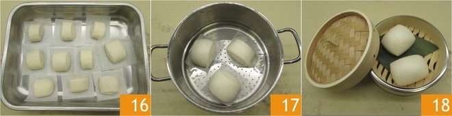 After this time, you're ready for cooking 16: bring the water to a boil in the steamer, place the buns inside, and close with the lid. Cook for 8-9 minutes, then turn off the heat and let them rest closed with the lid for a couple of minutes: this way the dough won't crack but will remain smooth 17. Serve your mantou in the typical bamboo basket 18!