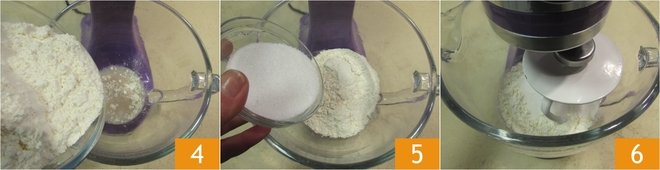 Add the wheat flour 4 and the sugar 5, and turn on the stand mixer at the lowest speed for 5-6 minutes 6.