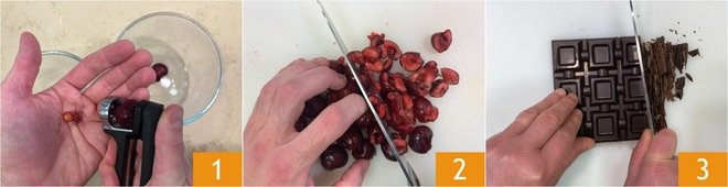 To prepare the chocolate and cherry cupcakes, first pit the cherries using the appropriate tool 1, then chop them coarsely 2. Chop the dark chocolate 3 and set aside.