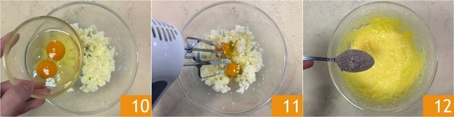 Add the eggs 10 and mix again with the whisks 11, then add the dry ingredients, one tablespoon at a time 12.