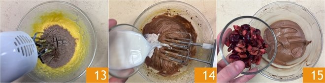 Work gradually with the whisks to incorporate them 13. Once they are well absorbed, pour in the milk 14 and mix again. At this point, add the chopped cherries 15.