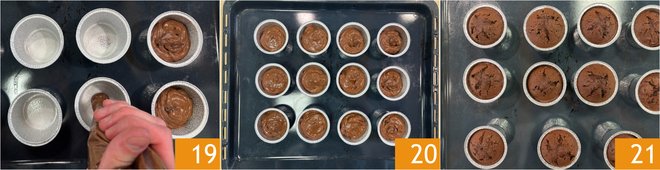 Place 12 aluminum baking cups, measuring 2.75x1.5 inches, on a baking tray and fill them with about 2.5 oz of batter each; you can use a spoon or a pastry bag 19. Bake in a preheated static oven at 356°F for about 28-30 minutes 20. Once baked, remove from the oven and let the cupcakes cool completely at room temperature 21.