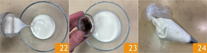 Meanwhile, pour the powdered sugar and cream into a bowl 22, add the vanilla extract 23, and beat with electric whisks. Transfer the whipped cream into a pastry bag with a plain nozzle 24.