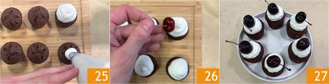 When the cupcakes have cooled, garnish the surface with a dollop of whipped cream 25 and finish with a cherry on top 26. Your chocolate and cherry cupcakes are ready to be enjoyed 27!