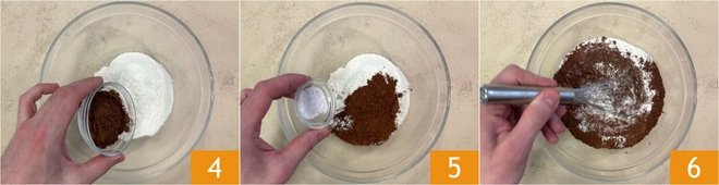 In a bowl, combine flour and cocoa 4, baking powder, and baking soda 5, then mix with a whisk 6 and set aside.