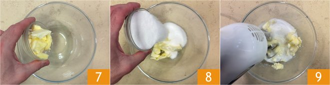 In another bowl, place the softened butter 7 and sugar 8, then beat with electric whisks for about a minute 9.