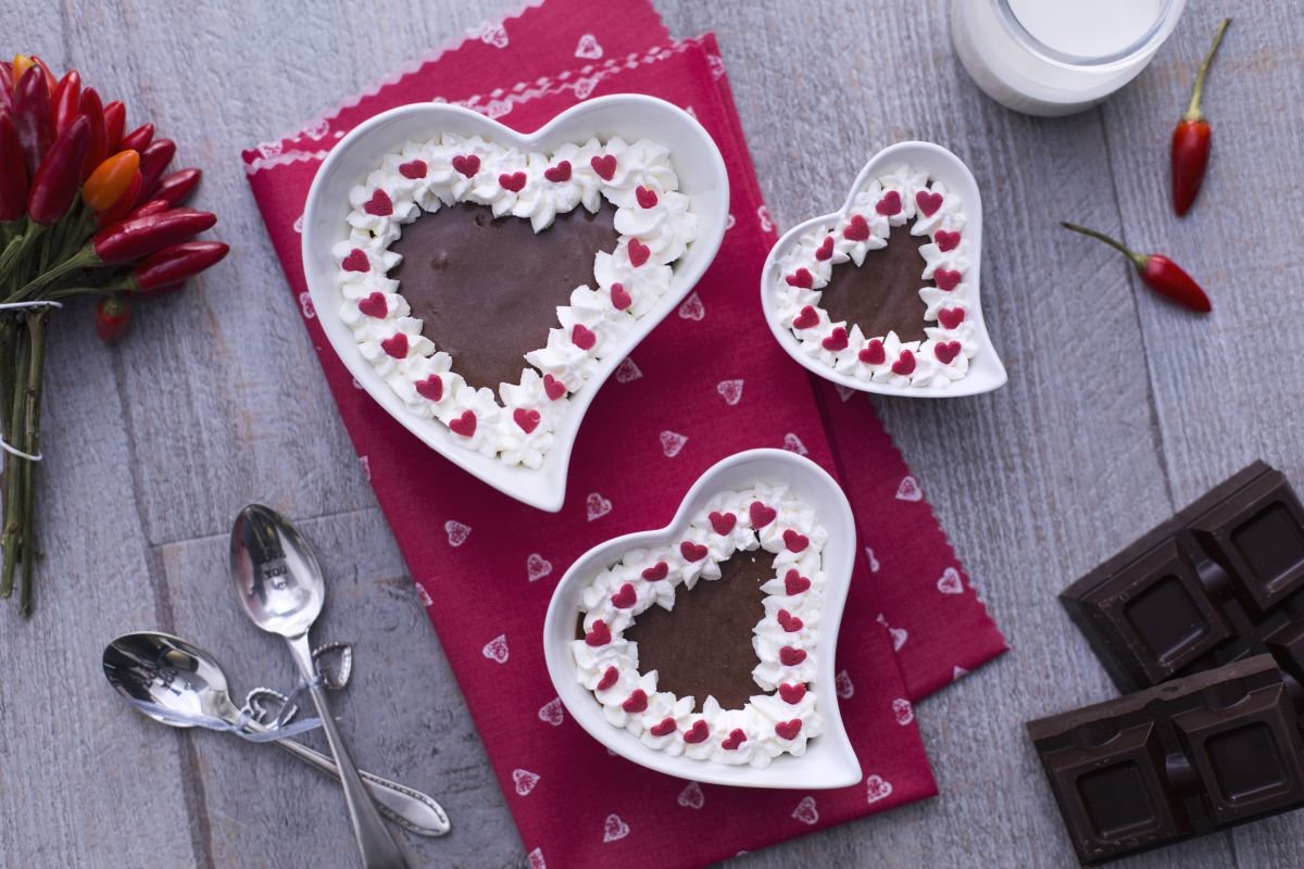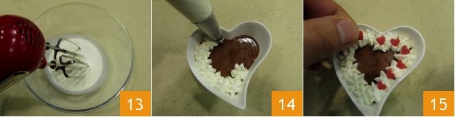 After the necessary time, whip the cold cream from the refrigerator with electric beaters 13 and decorate the now ready mousses using a star-tipped piping bag 14. Finish the decoration by distributing sugar hearts 15: your chocolate chili mousse is ready!