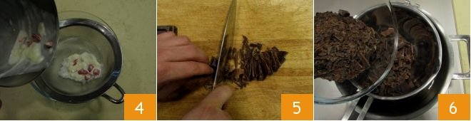 After this time, strain the cream discarding the surface film and the chili 4, then heat it again on very low heat. Chop the 60% dark chocolate into thin flakes 5 and melt it in a double boiler 6: if you don't have the appropriate utensil, you can put the chocolate in a bowl to be placed in a pot filled with a small amount of boiling water.