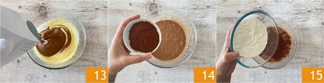 Continue mixing at medium speed 13 until you obtain a homogeneous mixture. Now add the sifted cocoa powder 15 and the sifted flour 15.